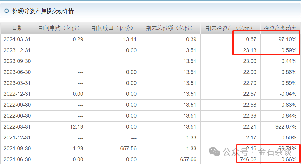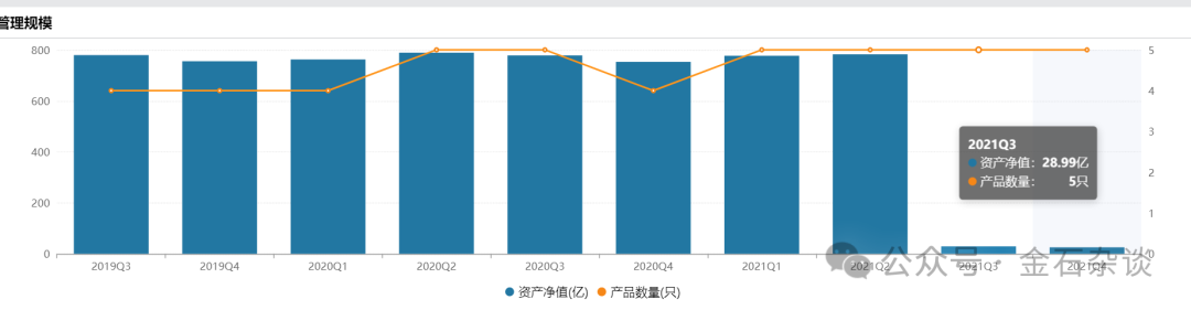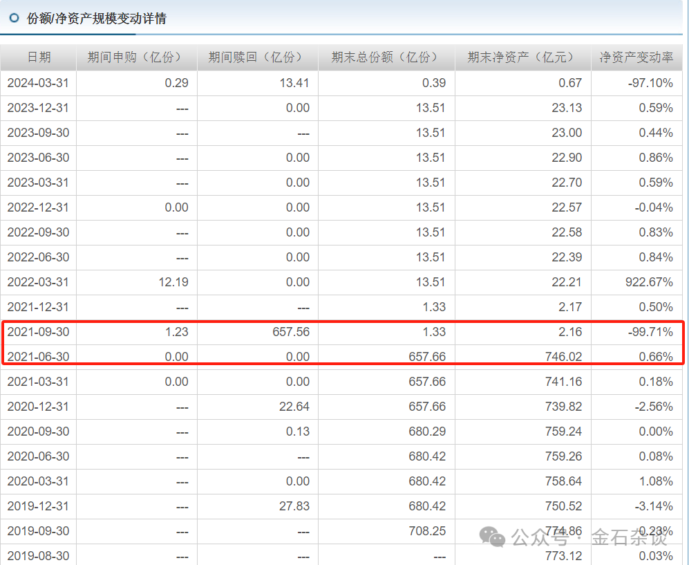 大家看,这家公募成立时大约300亿,但到了2017年规模突然增加到800亿。但是到了2021年9月30日,规模突然爆减744亿,规模骤降99.71%。