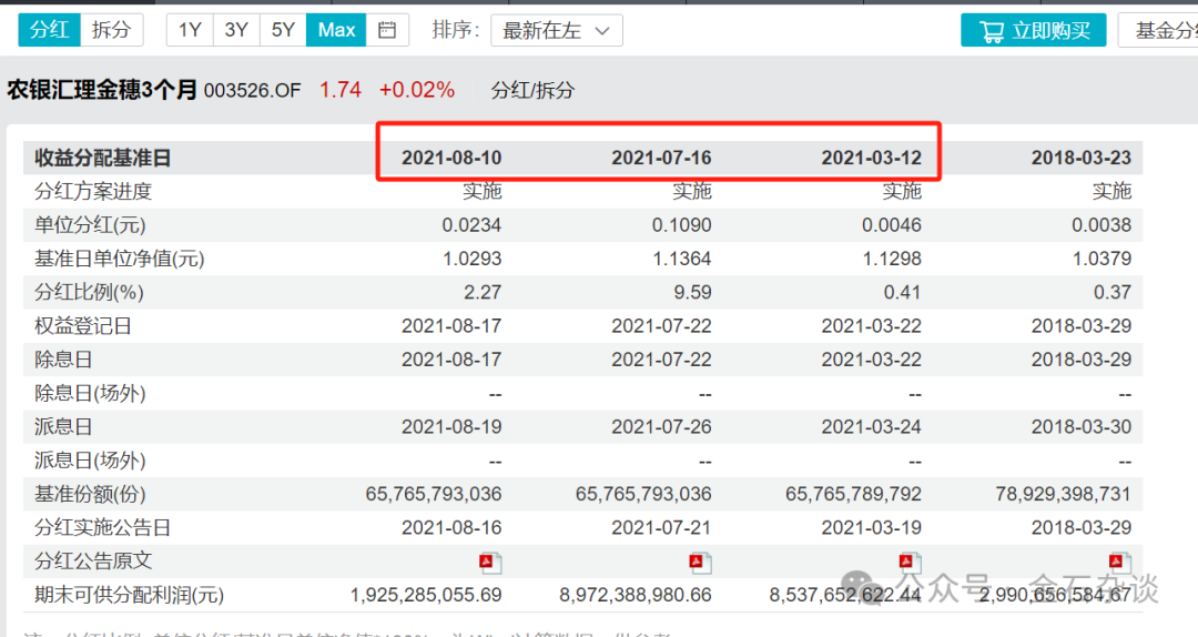二是,2021年,农银汇理股东离场之前,该产品进行了密集分红,三次分红让公司可供分配利润从85.38亿只剩下19.25亿,少了66亿之巨,农银汇理的股东可谓赚的彭满钵满。