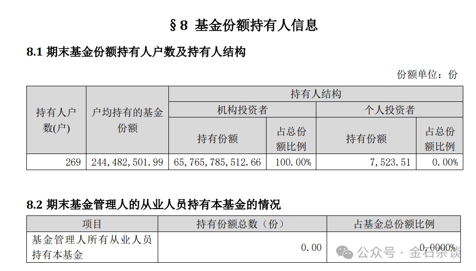 另一张截图则显示,该产品持仓为100%机构持仓,基民只持有7524份,彼时基金净值为1.1314,对应价值只有8500元,而机构持有744亿元。通过和上图结合看,本次农银汇理的股东持仓92.91%,其他机构持有46.54亿。
