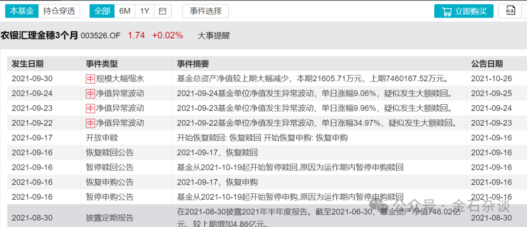 农银汇理的股东突然抛售离场,金石杂谈认为两方面原因:一是起到帮扶资金的作用,否则这只基金规模募集不到2亿,而且是发起式基金,3年到期是存在清盘风险的,毕竟股东离场后,该基金秒到2.16亿,近期再度巨额赎回,目前规模只有0.67亿,明显的帮扶资金在支撑。也就是说如果没有机构帮扶,这只基金即便成立了,也早已经清盘了。