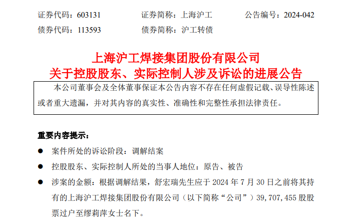 7月12日晚间,上海沪工(603131)公告,公司于近日收到舒宏瑞先生和缪莉萍女士的通知,经法院调解,双方已解除婚姻关系,并就离婚财产分割事宜作出相关安排。舒宏瑞应于7月30日之前将其持有的公司3970.75万股股票(占公司总股本的12.49%)过户至缪莉萍名下。按7月12日上海沪工收盘价13.38元计算,上述股份价值超5亿元。